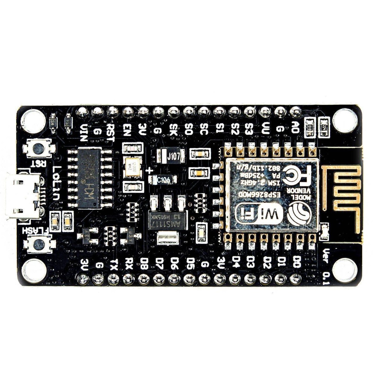 ماژول NodeMCU ESP8266 یک برد توسعه قدرتمند و اقتصادی برای پروژههای اینترنت اشیا (IoT) است. این برد بر پایه تراشه ESP8266 ساخته شده و از WiFi داخلی برای ارتباط بیسیم استفاده میکند. وجود مبدل USB به سریال CH340 باعث شده تا برنامهریزی و ارتباط با رایانه بهسادگی از طریق کابل USB انجام شود.